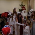 Sál byl vyzdobený právě obrázky s mikulášskou trojicí a v první části si děti společně vyprávěly, zpívaly, hrály na hudební nástroje a tancovaly. Pak se ozvalo cinkání zvonečku a do sálu postupně přicházel Mikuláš s andělem, a to ne s jedním, ale hned se čtyřmi. Vítání s dětmi přerušilo zabušení na dveře a vstoupila banda čertů, za kterou se přihnal lamentující čert – sice nejmenší, ale nejdůležitější – marioneta voděná na nitích. Čerti sice nadělali hodně hluku, ale nakonec se ukázalo, že nejsou nijak zlí, že jsou to spíše takoví potrhlí srandisti.