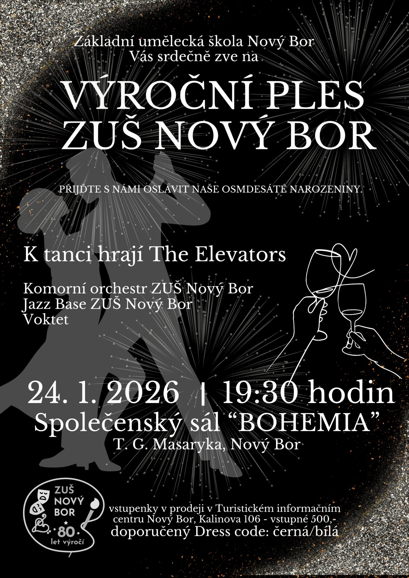 Dovolte nám Vás pozvat na Výroční ples ZUŠ Nový Bor, který se uskuteční v sobotu 24. 1. 2026, 19:30 hodin ve Společenském sále „Bohemia“. Vstupenky si můžete zakoupit v Turistickém informačním centru v Novém Boru, Kalinova 106, od 1. 10. 2025. Platba lze pouze v hotovosti a cena vstupenky je 500 Kč.