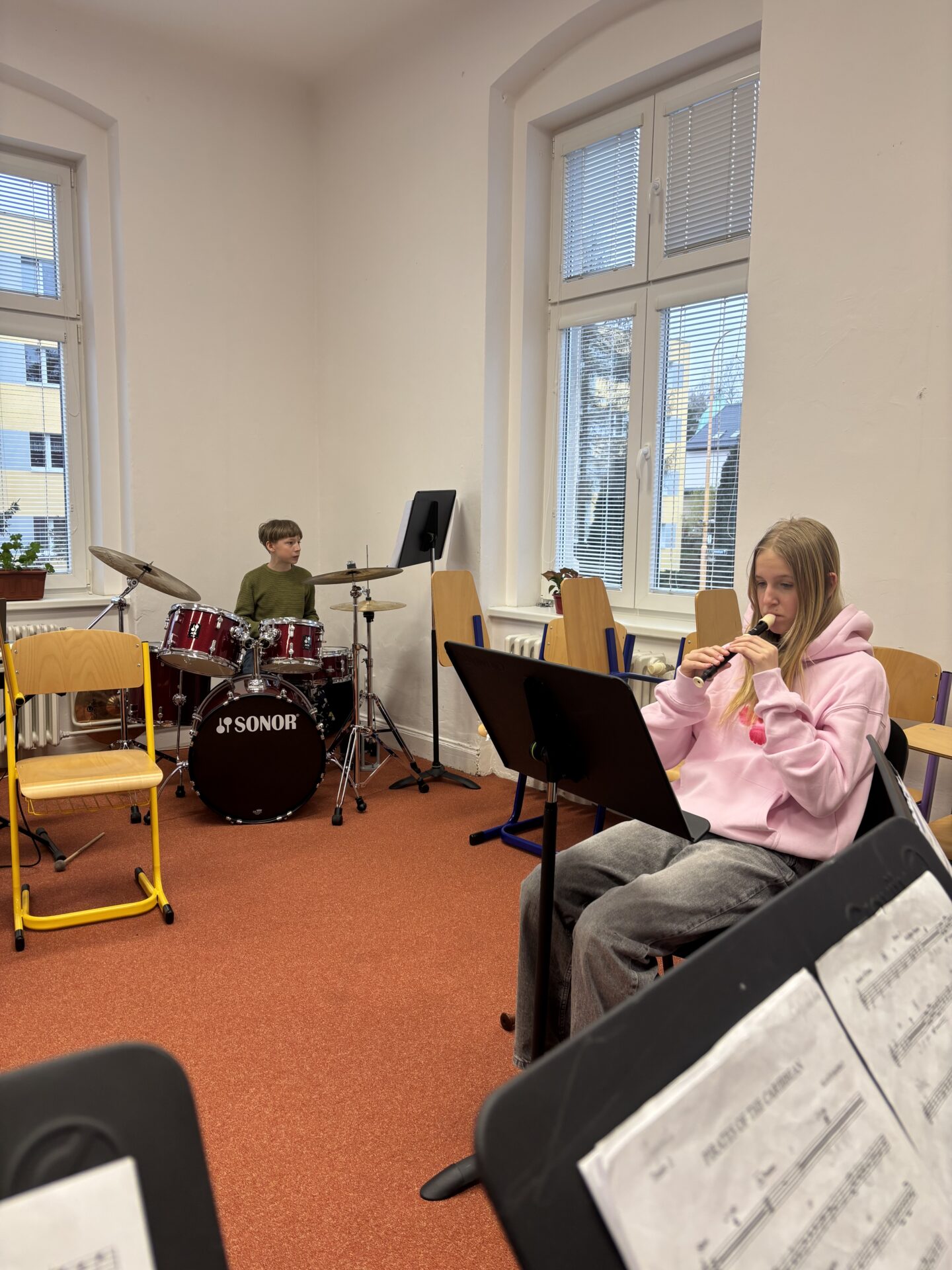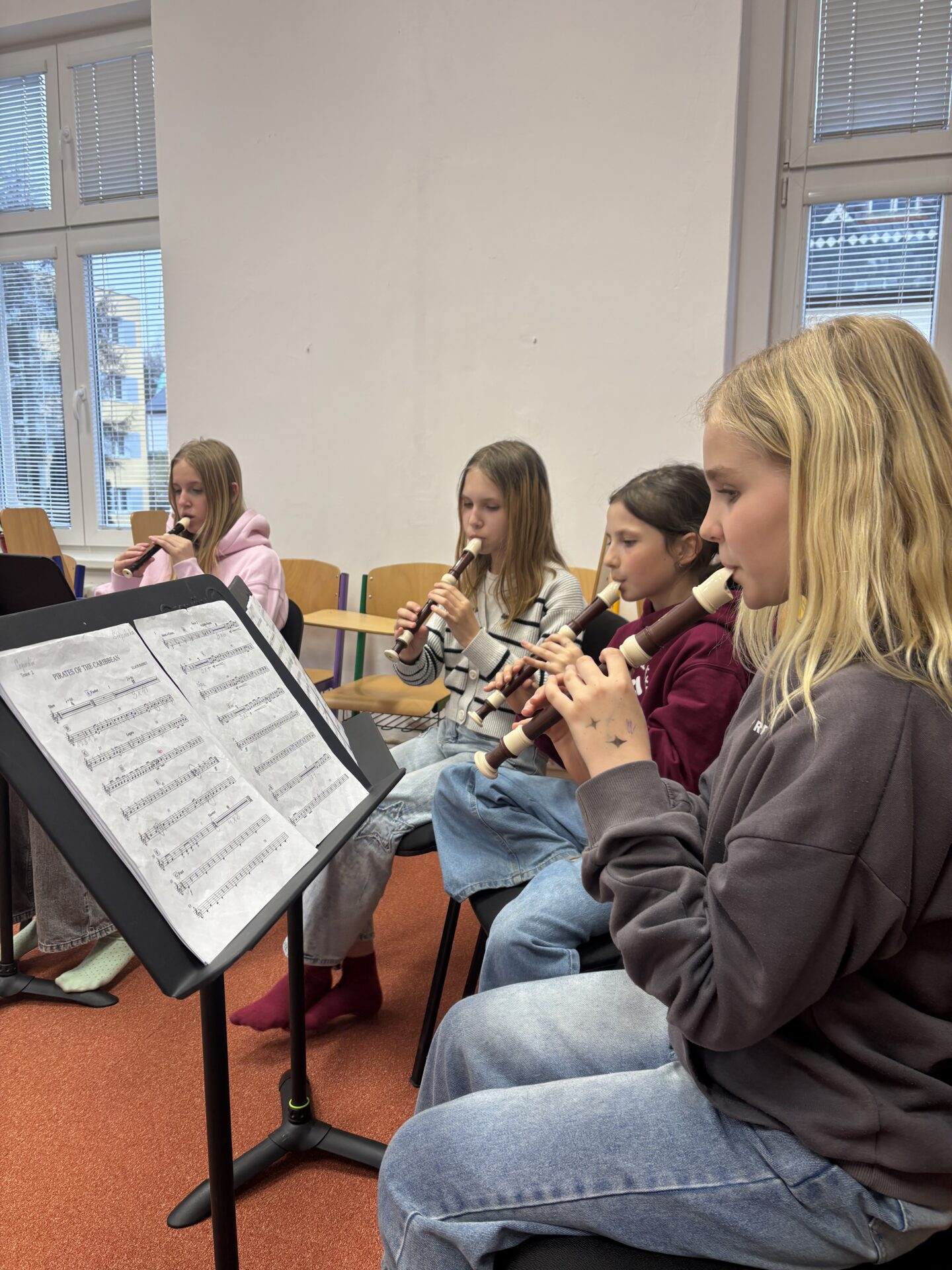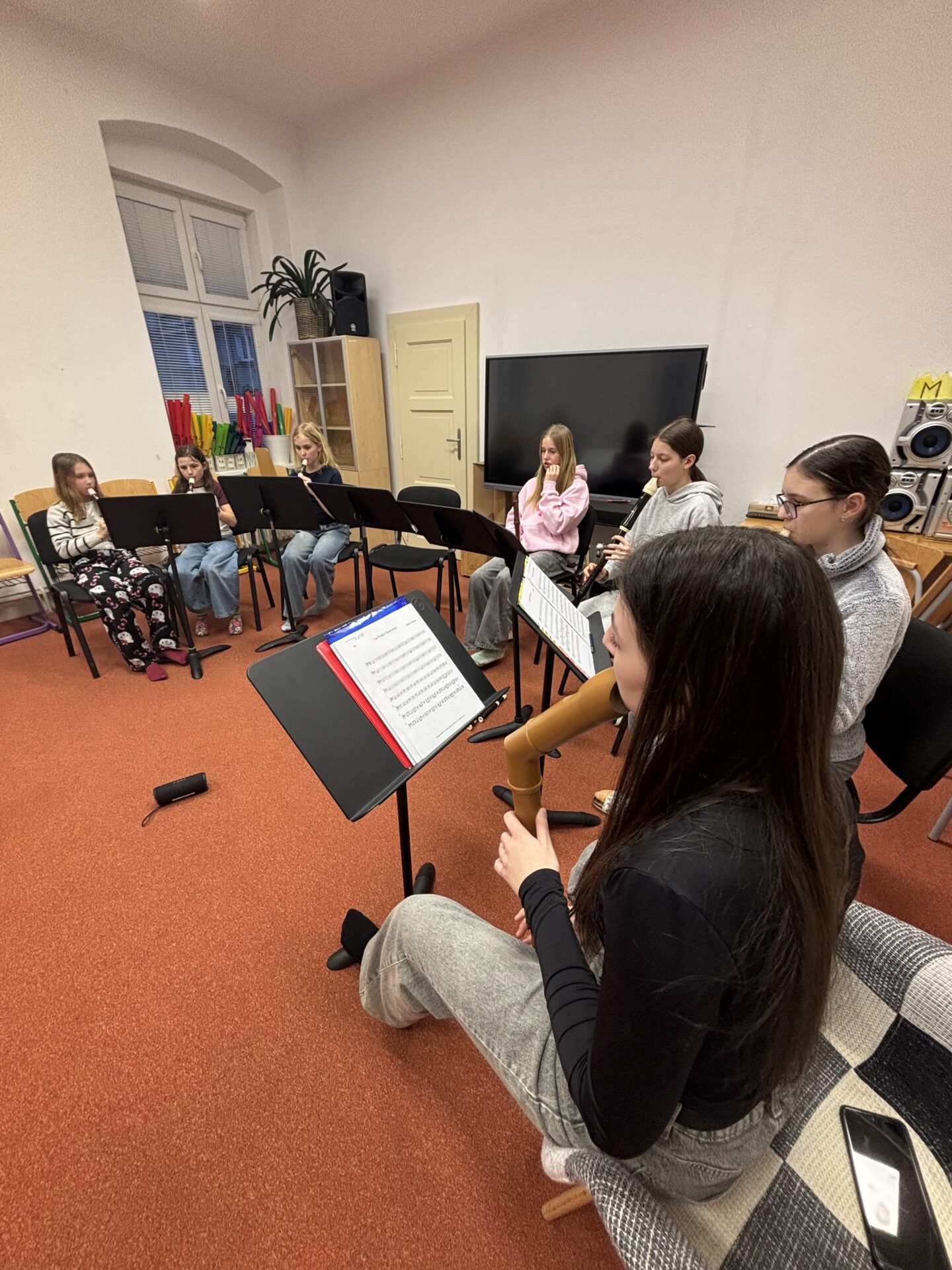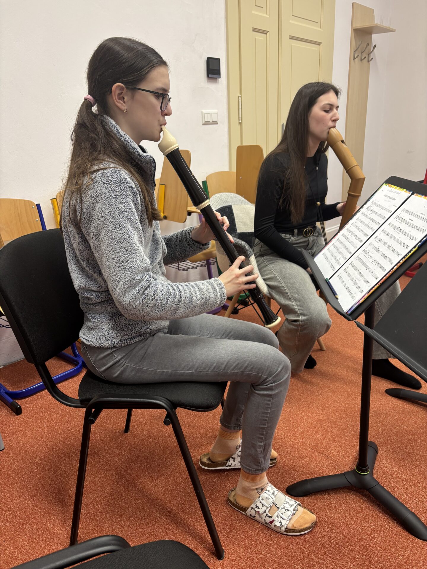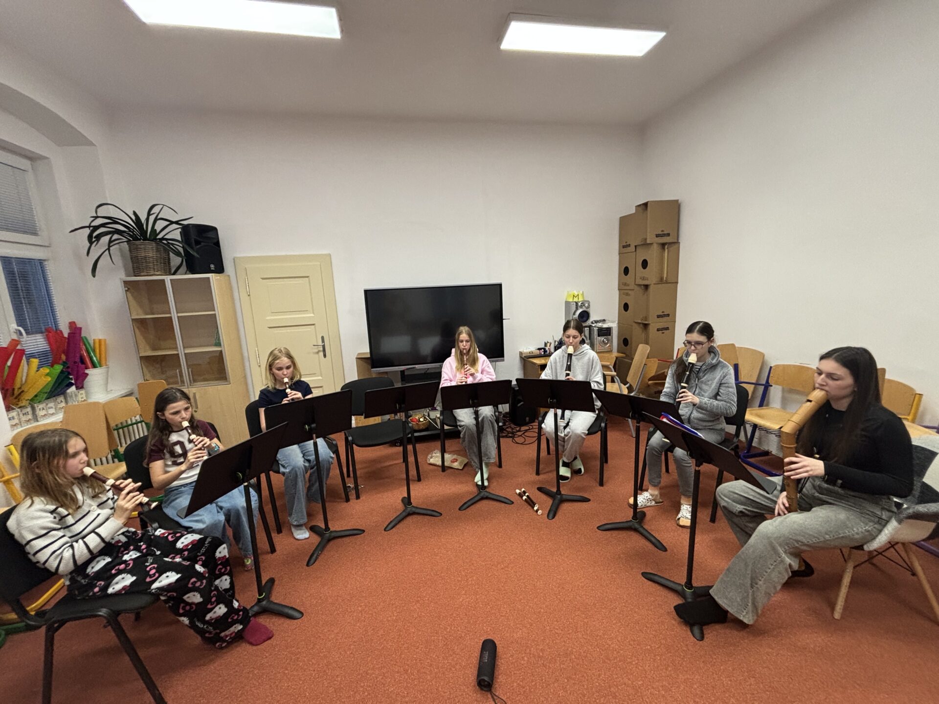 Odpoledne dorazili žáci vybaveni spacáky, karimatkami, plyšáky a samozřejmě flétnami – protože bez těch by to bylo spíš soustředění přežití než hudební. Už od čtyř hodin jsme pilně cvičili a musím říct, že tempo bylo obdivuhodné. Stihli jsme toho tolik, že by se za to nestyděl ani profesionální orchestr (který by si ale asi dal víc přestávek na kávu).
