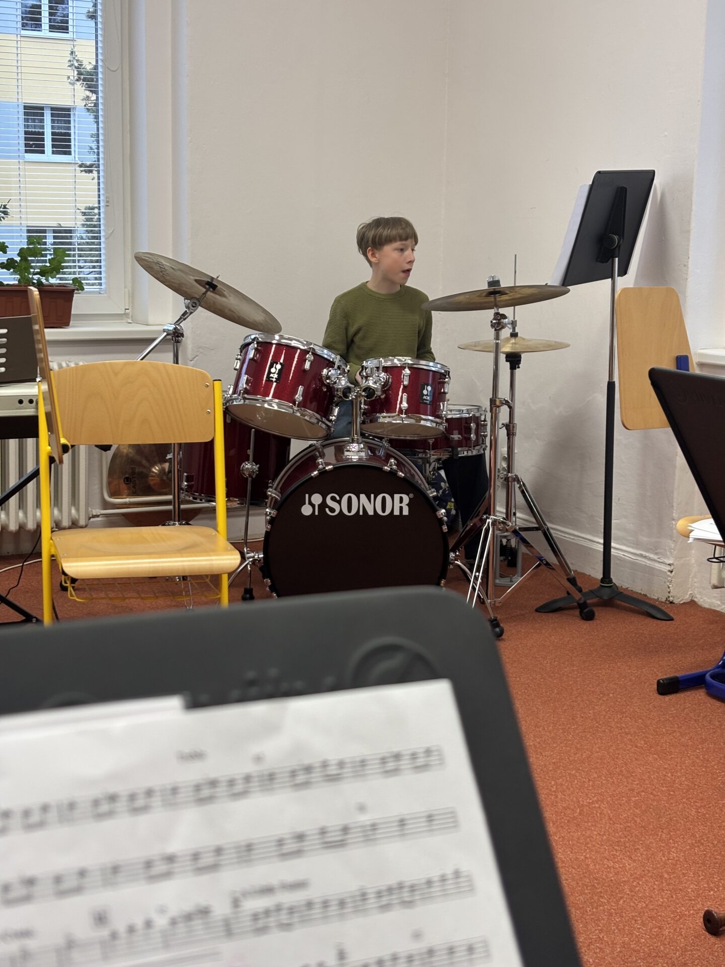Na část zkoušky dorazil i náš nadějný bicista Jonáš, který dnes předvedl výkon, při kterém by i metronom začal tleskat. Rytmus držel tak pevně, že by se na něm daly stavět mosty.