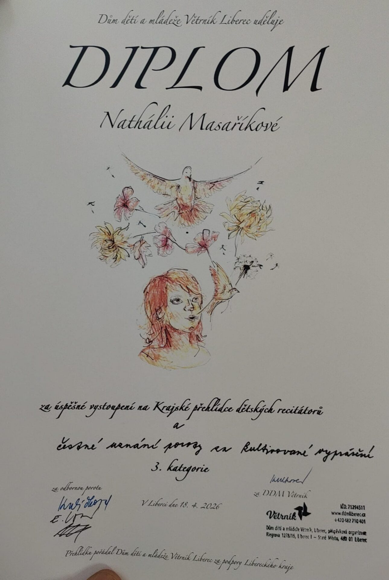 Nathálie Masaříková s básní Ivana Martina Jirouse „Ptala se Františky Marta“ natolik zaujala svou interpretací, že byla vybrána jako náhradnice pro celostátní kolo. Je to pro ni obrovské uznání její poctivé přípravy a schopnosti předat hloubku a křehkost Jirousových veršů.