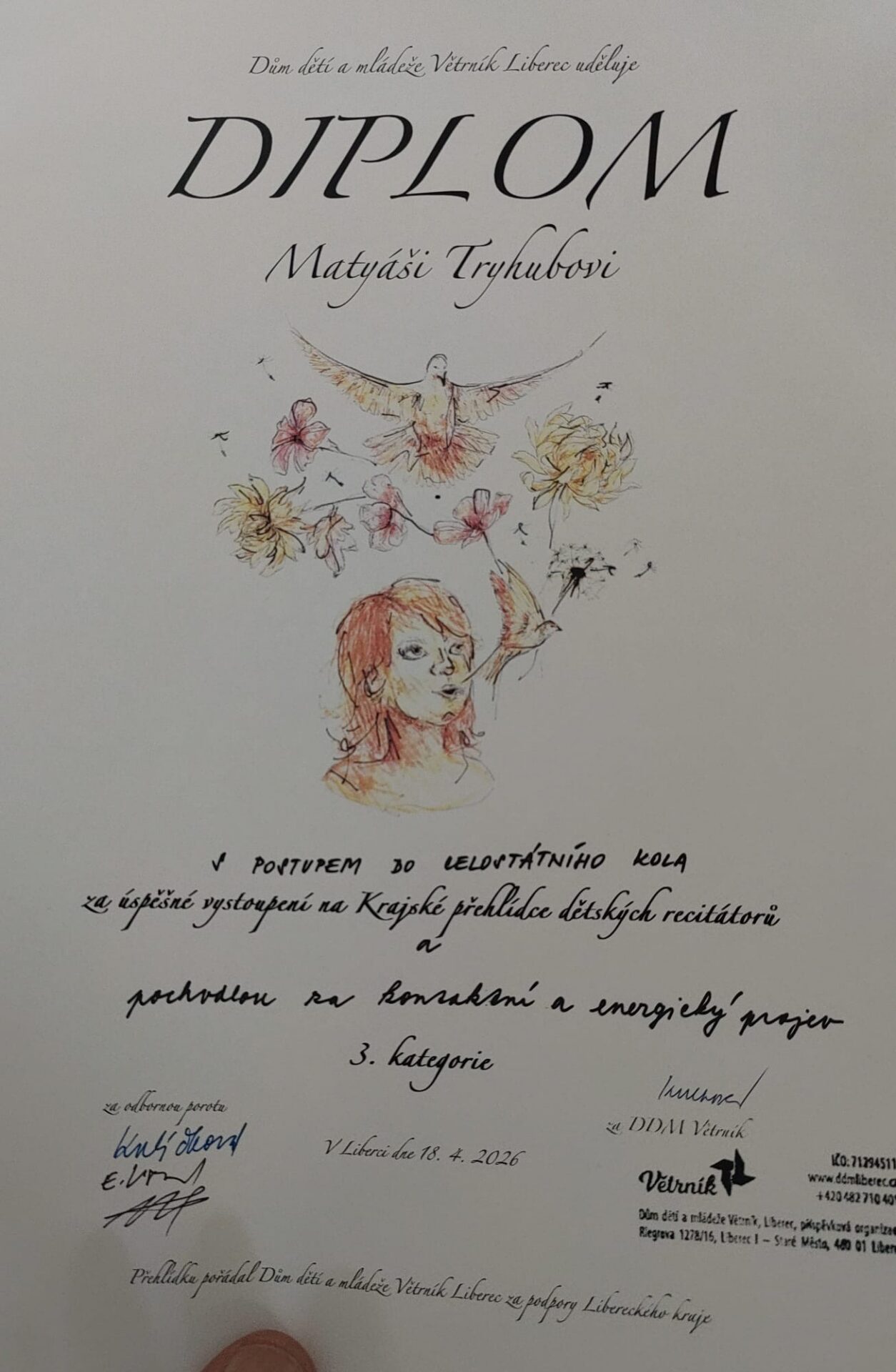 Mám obrovskou radost, o kterou se s vámi musím podělit. Naše společná práce v literárně-dramatickém oboru přinesla v krajském kole v Liberci úžasné výsledky. Dva naši žáci se probojovali mezi ty nejlepší recitátory z celé republiky a v červnu nás budou reprezentovat na 54. celostátní přehlídce Dětská scéna 2026 ve Svitavách.