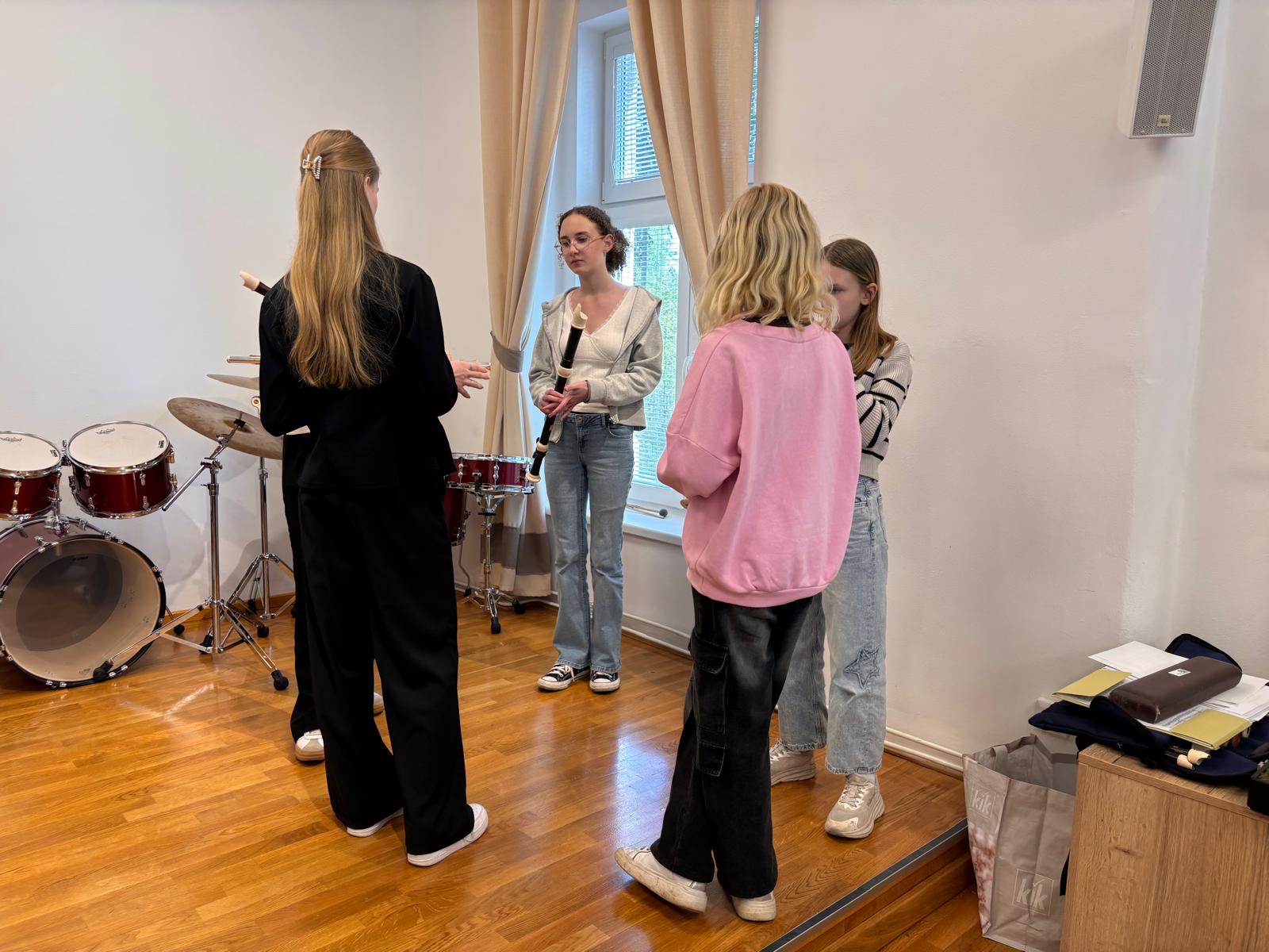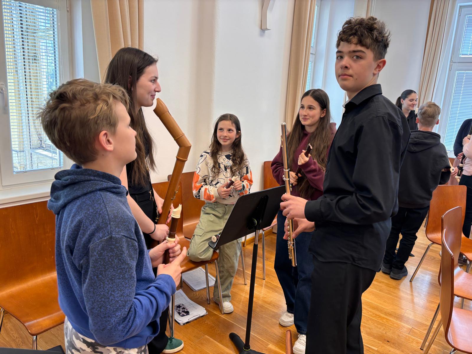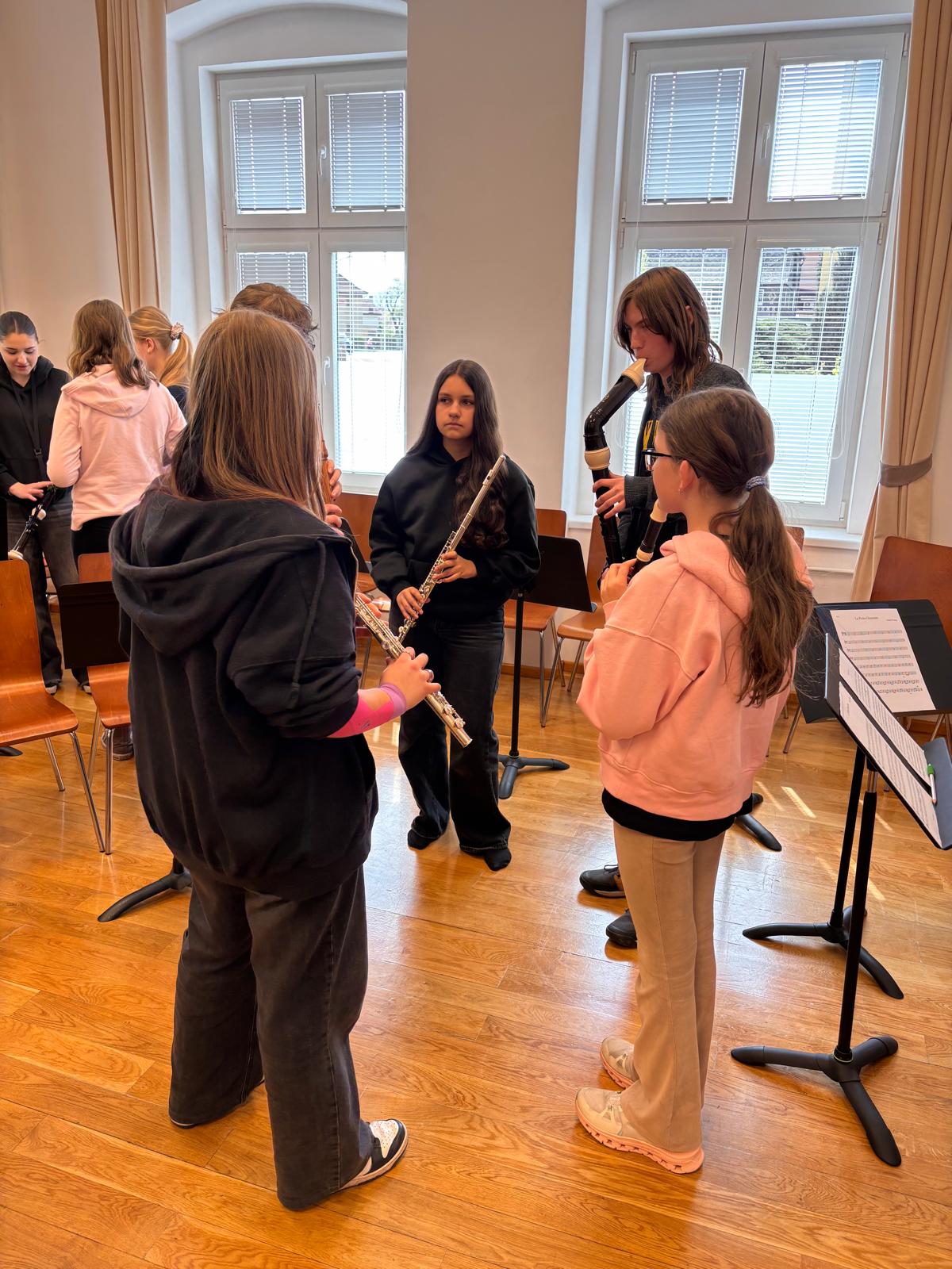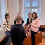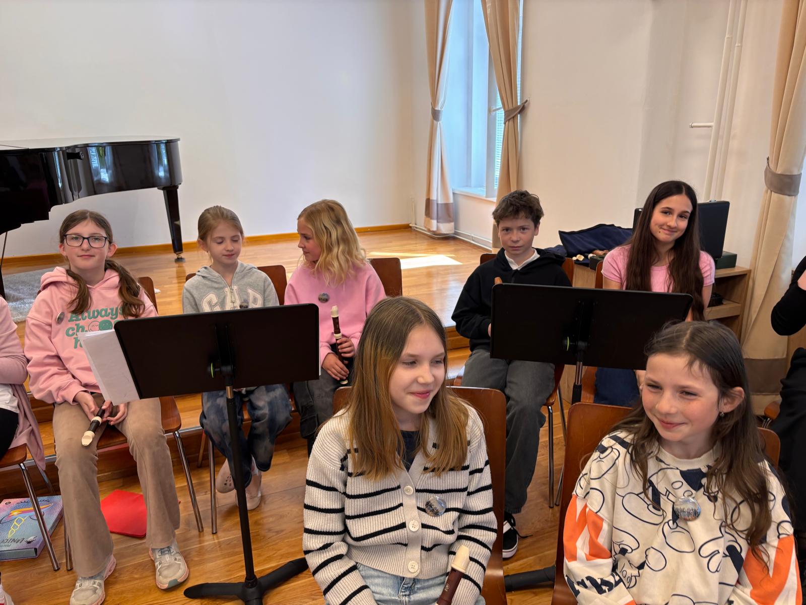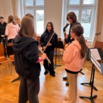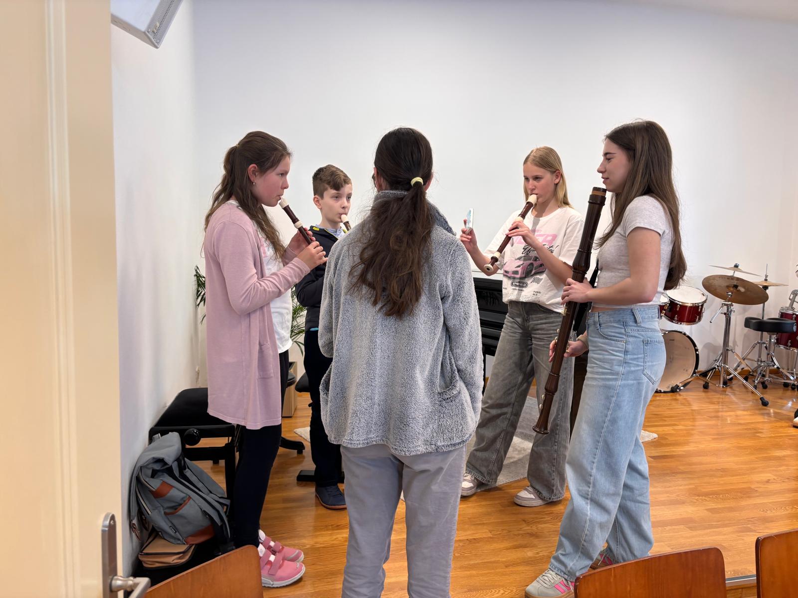 Po vydatném obědě, kdy si všichni pochutnali na pizze, přišla krátká pauza na odpočinek. Ta ale netrvala dlouho – hudební nadšení brzy znovu zvítězilo a pokračovalo se dál. Odpolední část patřila moderním technikám hry na flétnu. Žáci byli rozděleni do pěti skupin a čekala je kreativní výzva: vylosovat si téma a hudebně ztvárnit příběh. Objevily se nápady jako „hlemýžď na výletě“, „obchodní dům“ nebo „ptáček v továrně“. Každá skupina se s úkolem popasovala s odvahou i fantazií a vznikla originální a často i úsměvná hudební vystoupení.