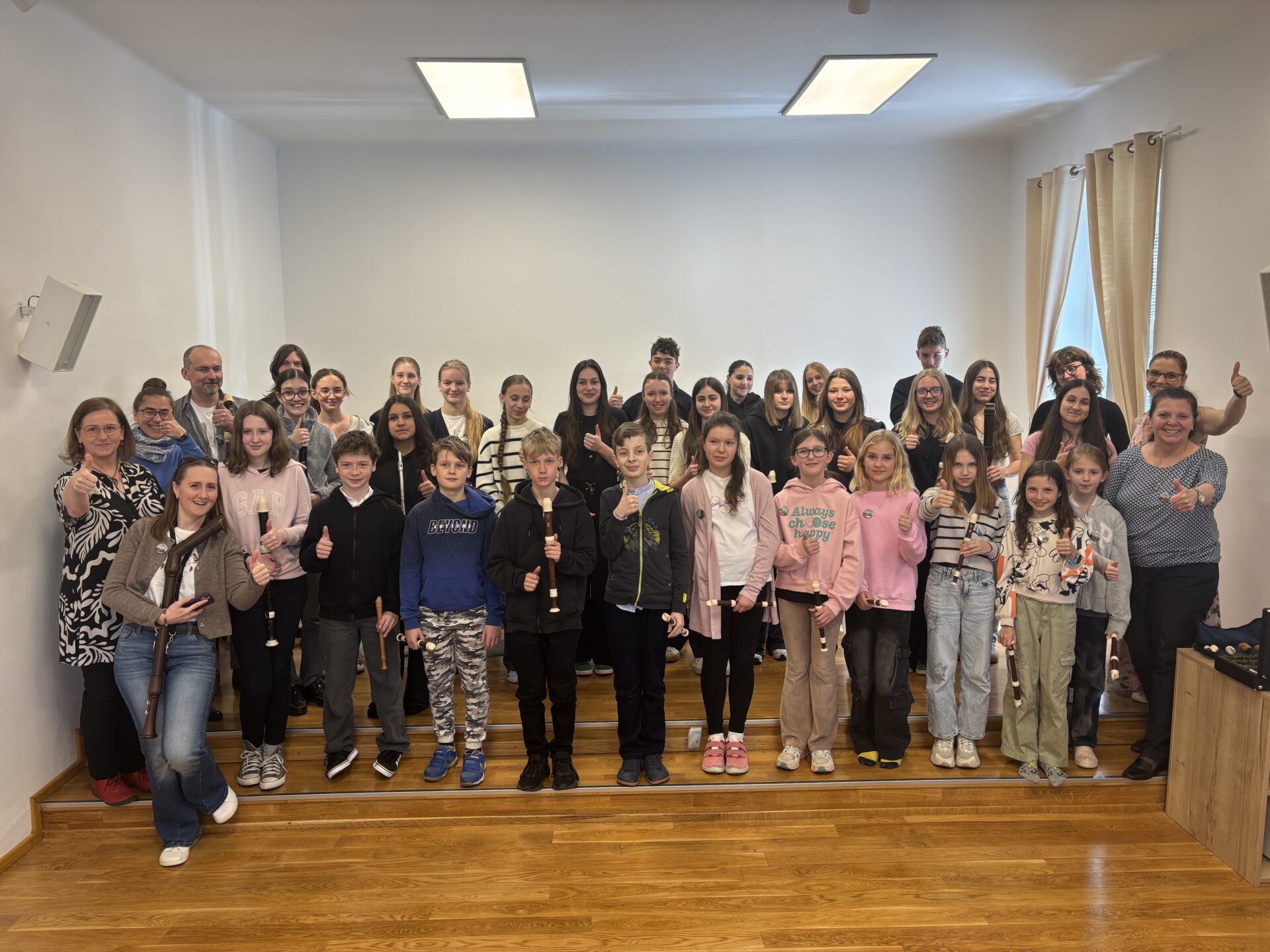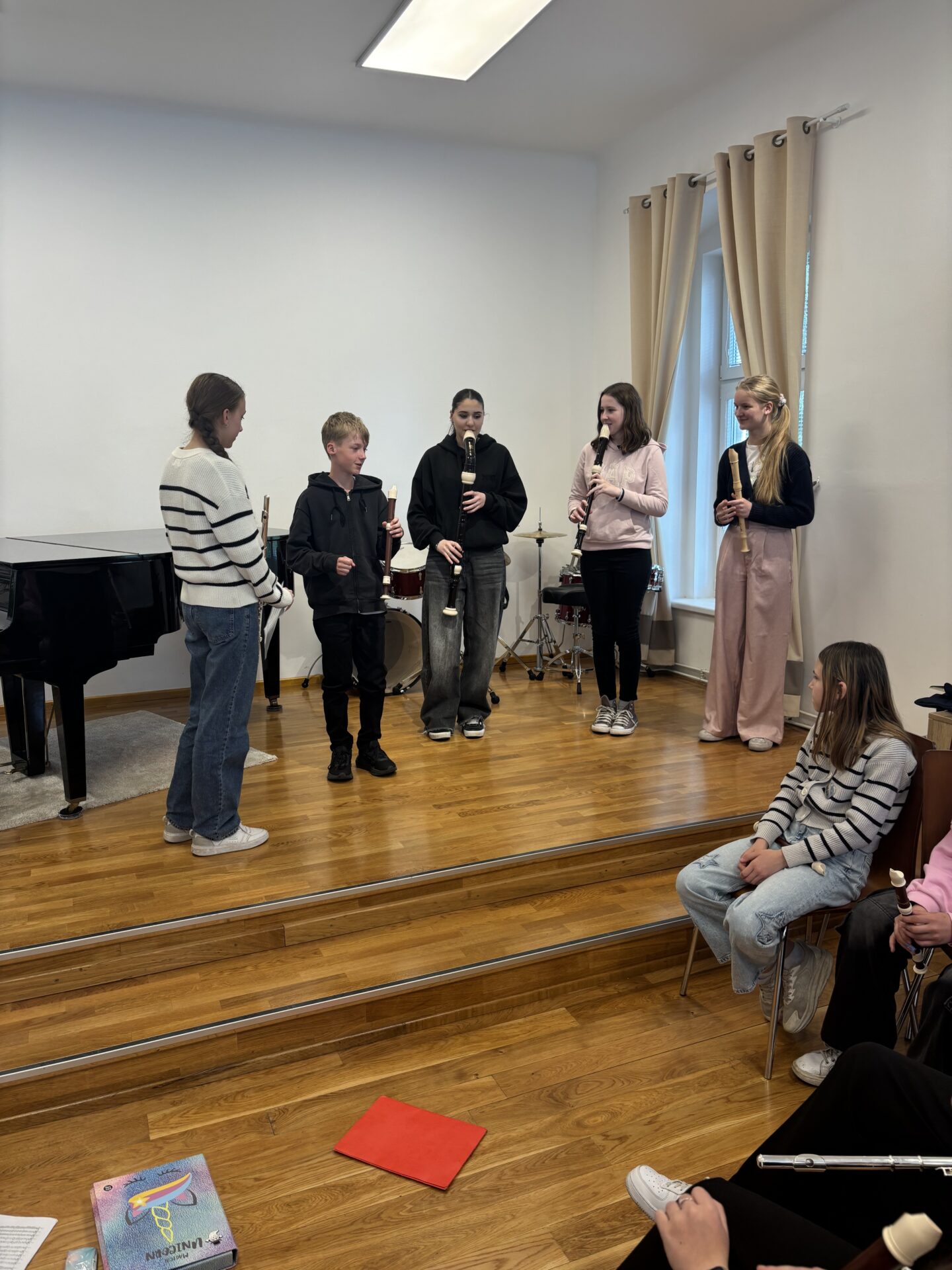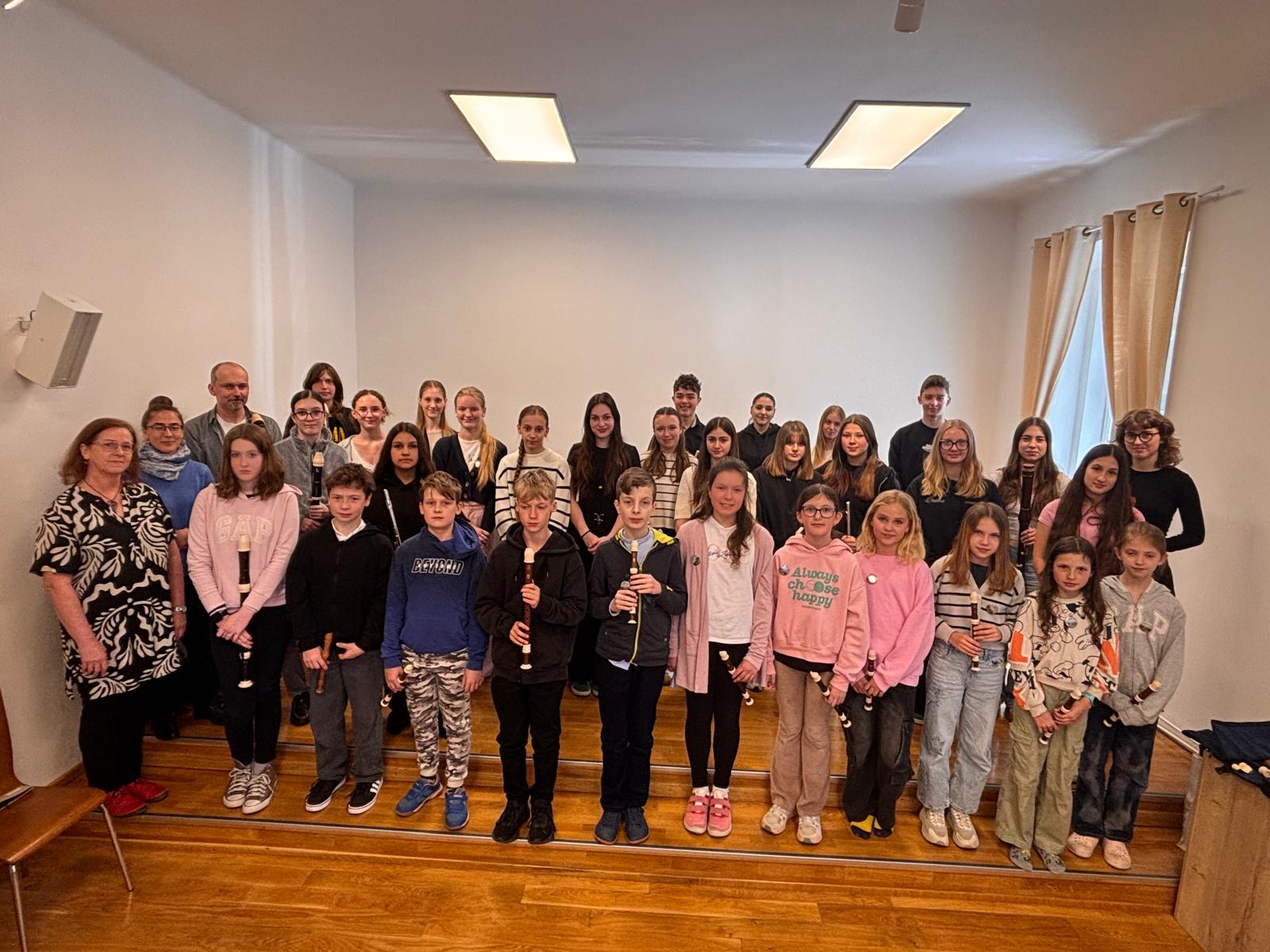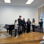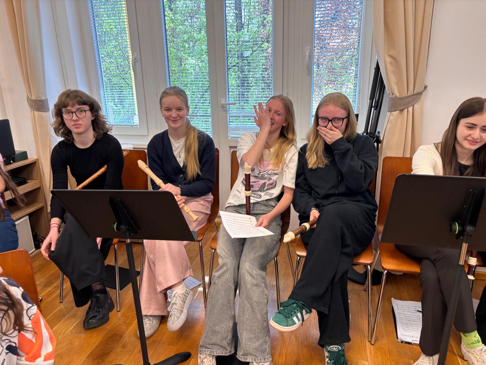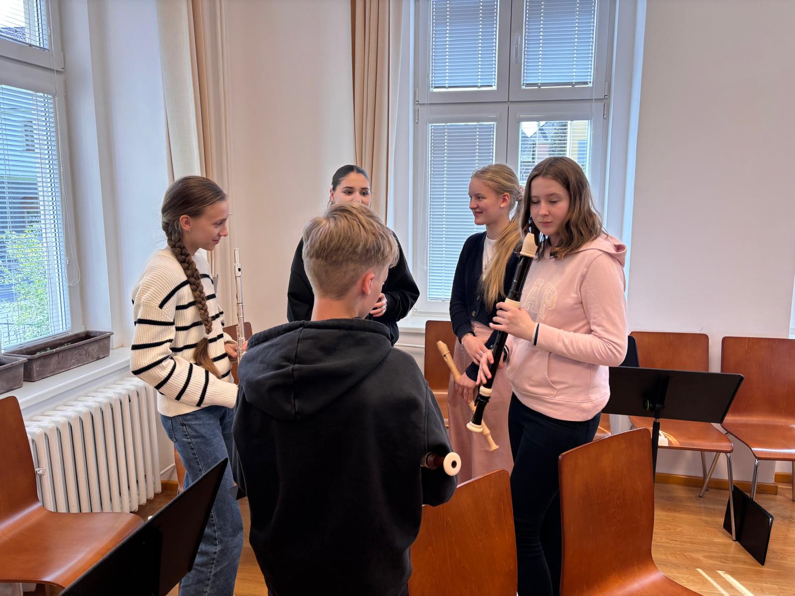 Po vydatném obědě, kdy si všichni pochutnali na pizze, přišla krátká pauza na odpočinek. Ta ale netrvala dlouho – hudební nadšení brzy znovu zvítězilo a pokračovalo se dál. Odpolední část patřila moderním technikám hry na flétnu. Žáci byli rozděleni do pěti skupin a čekala je kreativní výzva: vylosovat si téma a hudebně ztvárnit příběh. Objevily se nápady jako „hlemýžď na výletě“, „obchodní dům“ nebo „ptáček v továrně“. Každá skupina se s úkolem popasovala s odvahou i fantazií a vznikla originální a často i úsměvná hudební vystoupení.