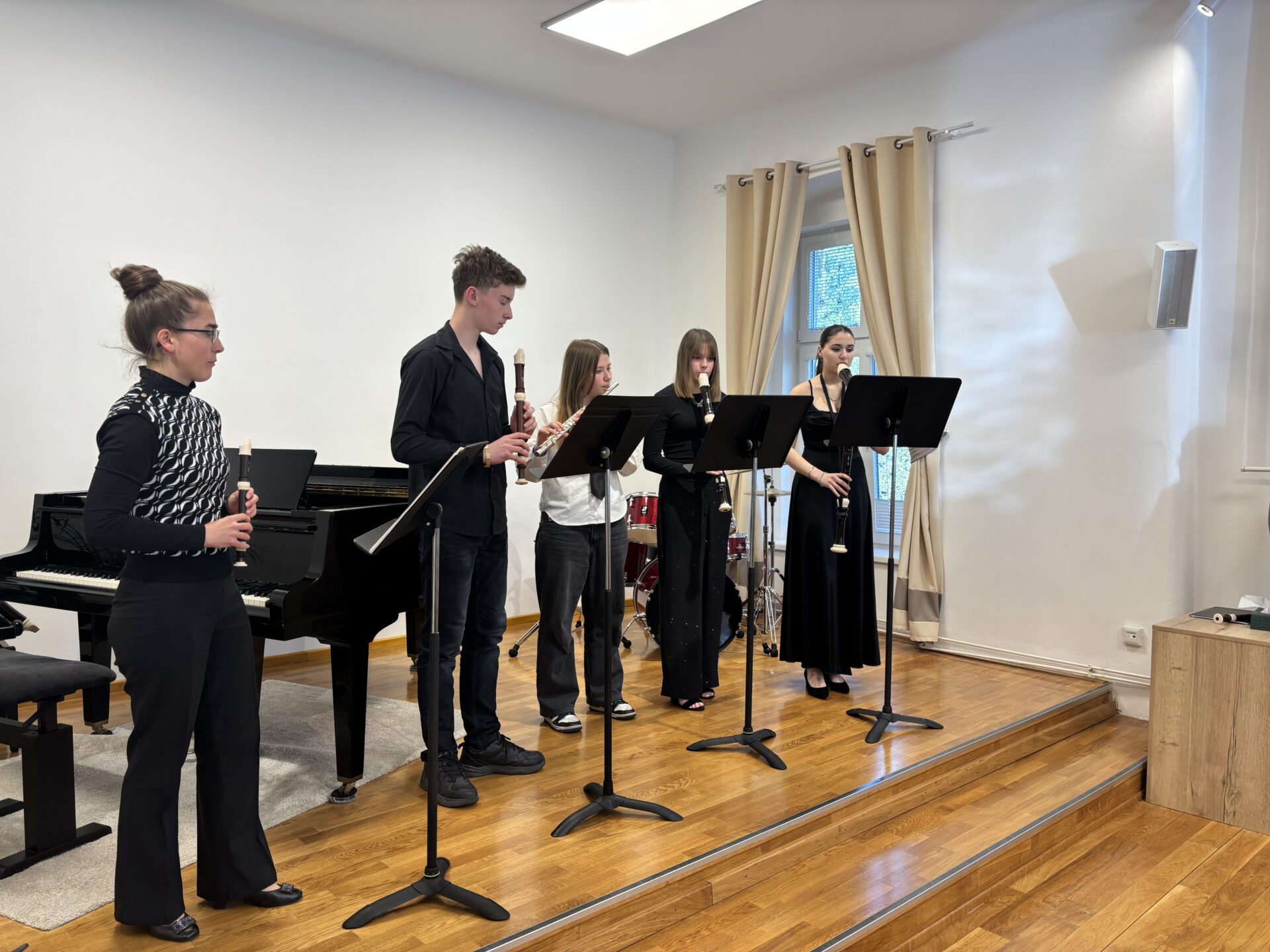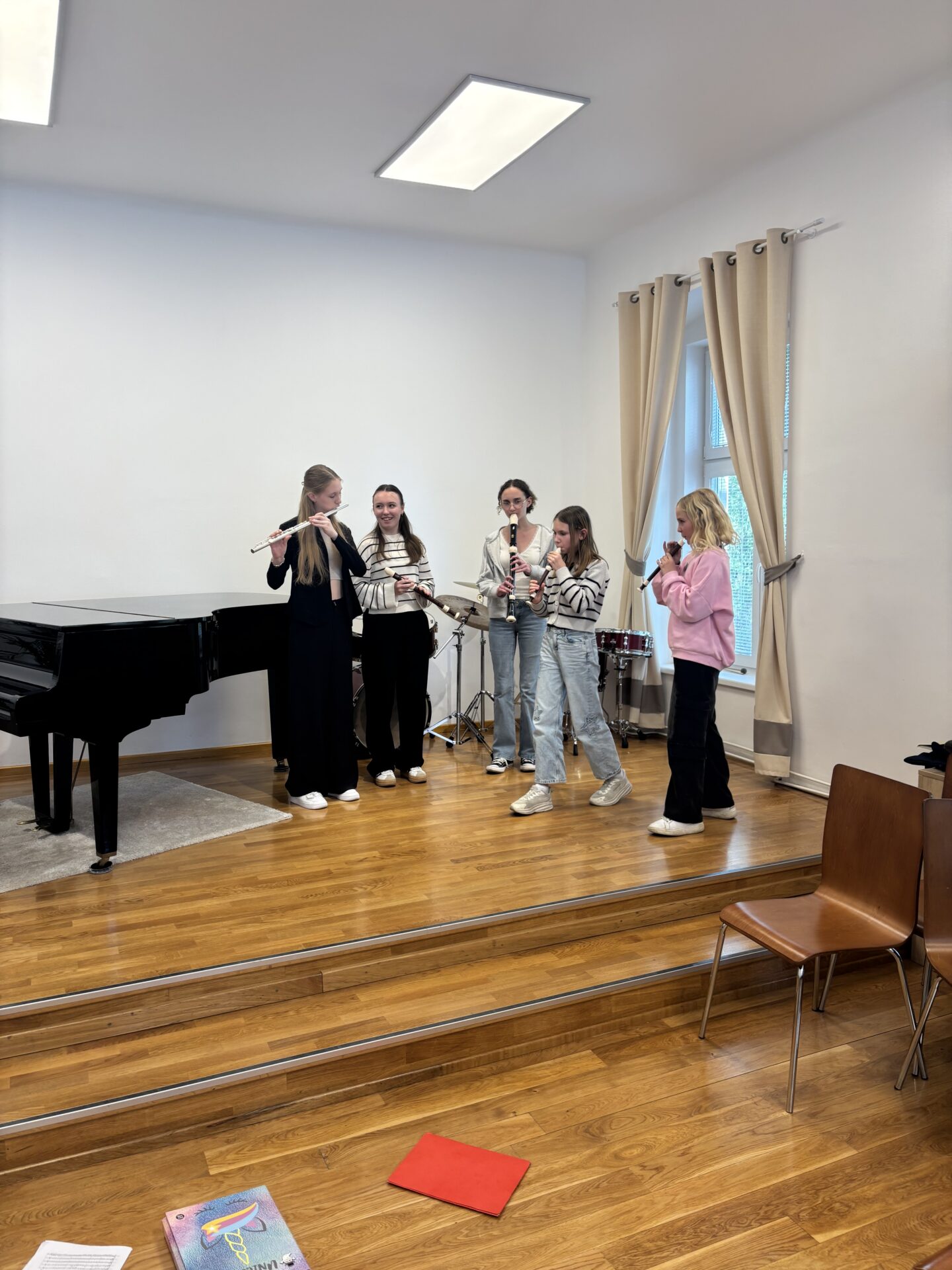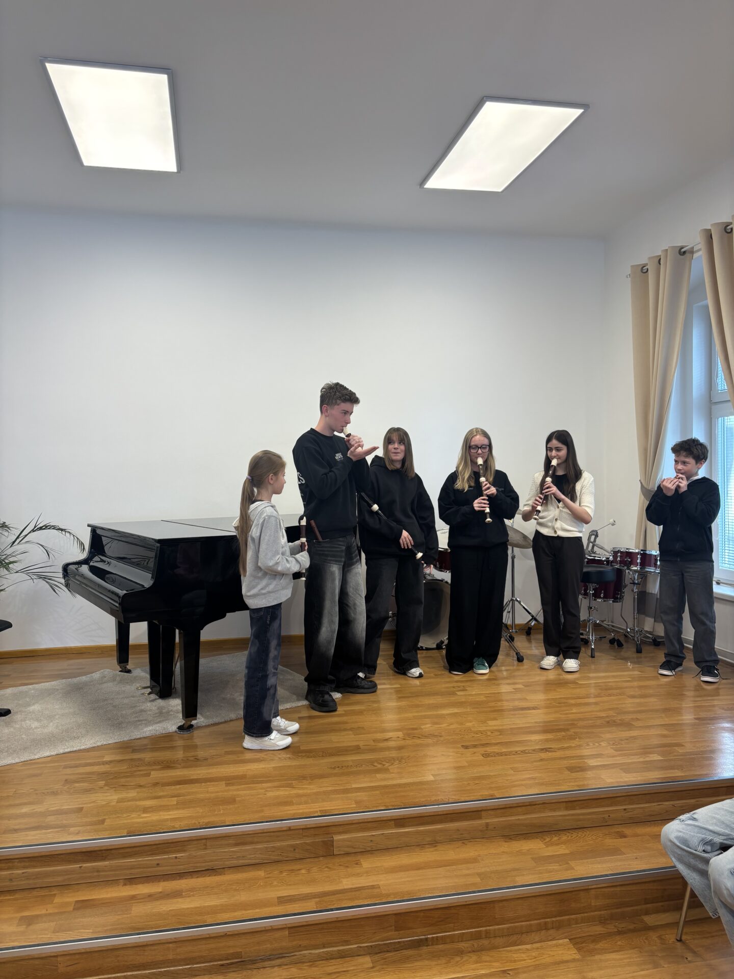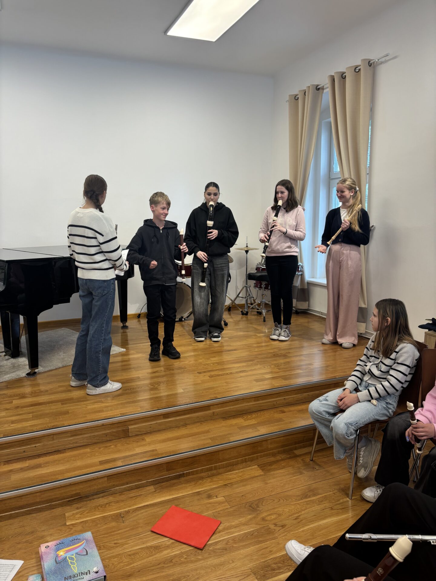 Po vydatném obědě, kdy si všichni pochutnali na pizze, přišla krátká pauza na odpočinek. Ta ale netrvala dlouho – hudební nadšení brzy znovu zvítězilo a pokračovalo se dál. Odpolední část patřila moderním technikám hry na flétnu. Žáci byli rozděleni do pěti skupin a čekala je kreativní výzva: vylosovat si téma a hudebně ztvárnit příběh. Objevily se nápady jako „hlemýžď na výletě“, „obchodní dům“ nebo „ptáček v továrně“. Každá skupina se s úkolem popasovala s odvahou i fantazií a vznikla originální a často i úsměvná hudební vystoupení.
