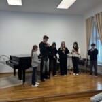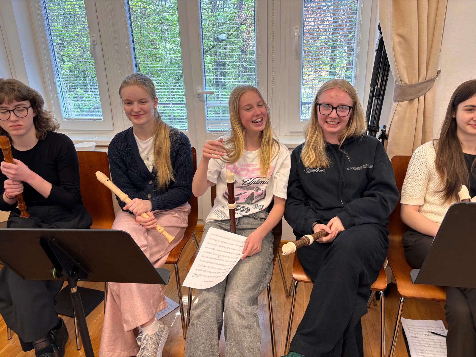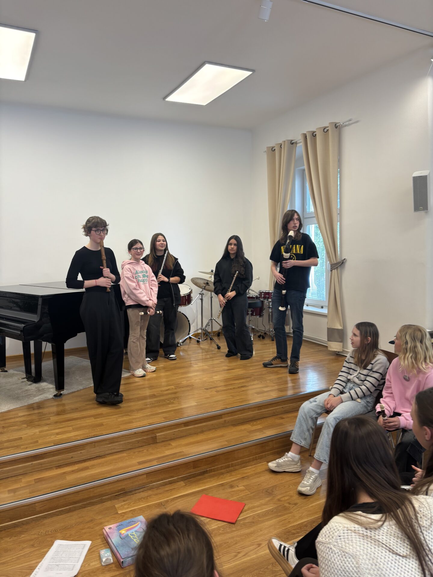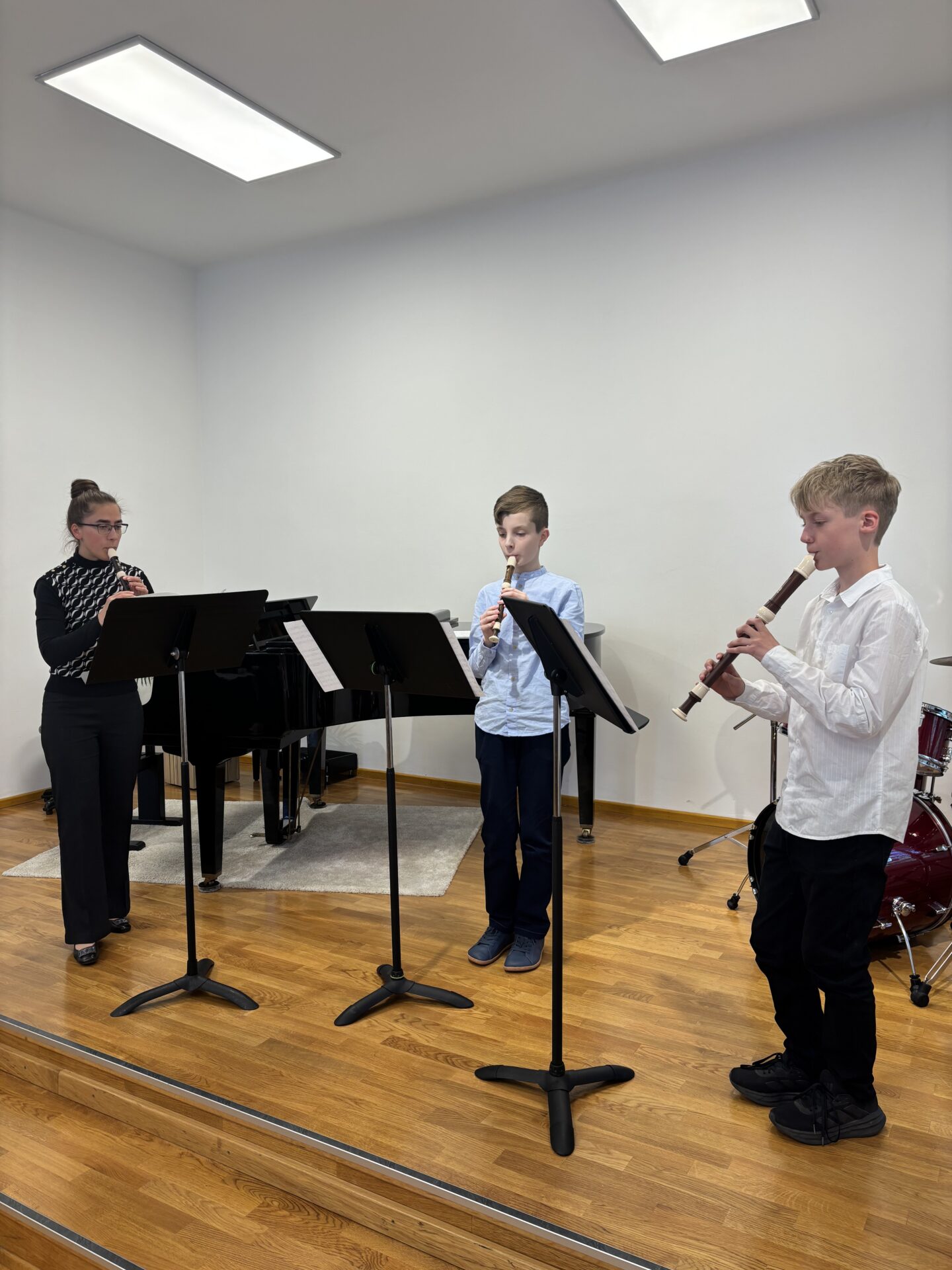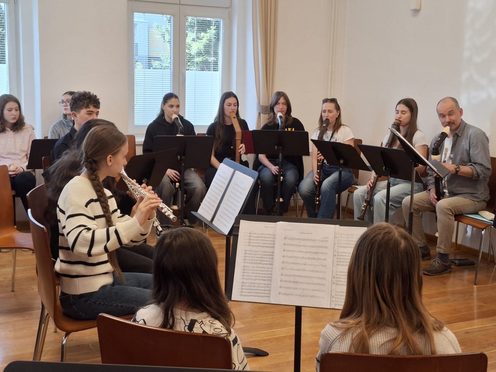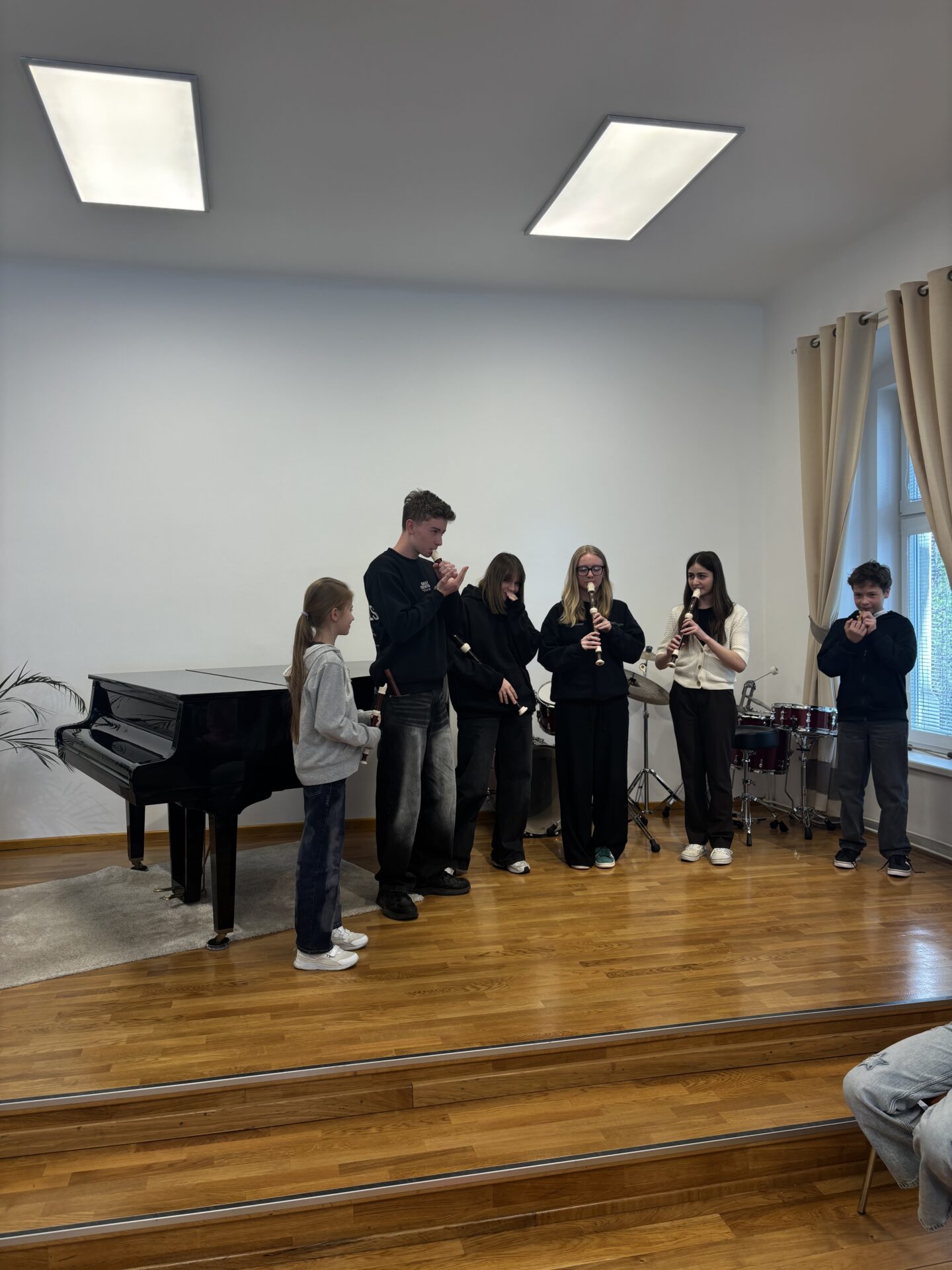 Po vydatném obědě, kdy si všichni pochutnali na pizze, přišla krátká pauza na odpočinek. Ta ale netrvala dlouho – hudební nadšení brzy znovu zvítězilo a pokračovalo se dál. Odpolední část patřila moderním technikám hry na flétnu. Žáci byli rozděleni do pěti skupin a čekala je kreativní výzva: vylosovat si téma a hudebně ztvárnit příběh. Objevily se nápady jako „hlemýžď na výletě“, „obchodní dům“ nebo „ptáček v továrně“. Každá skupina se s úkolem popasovala s odvahou i fantazií a vznikla originální a často i úsměvná hudební vystoupení.