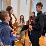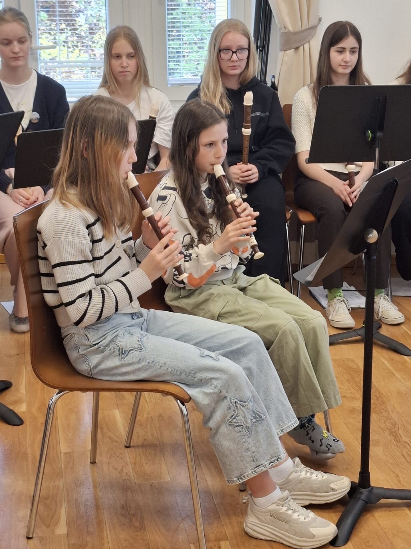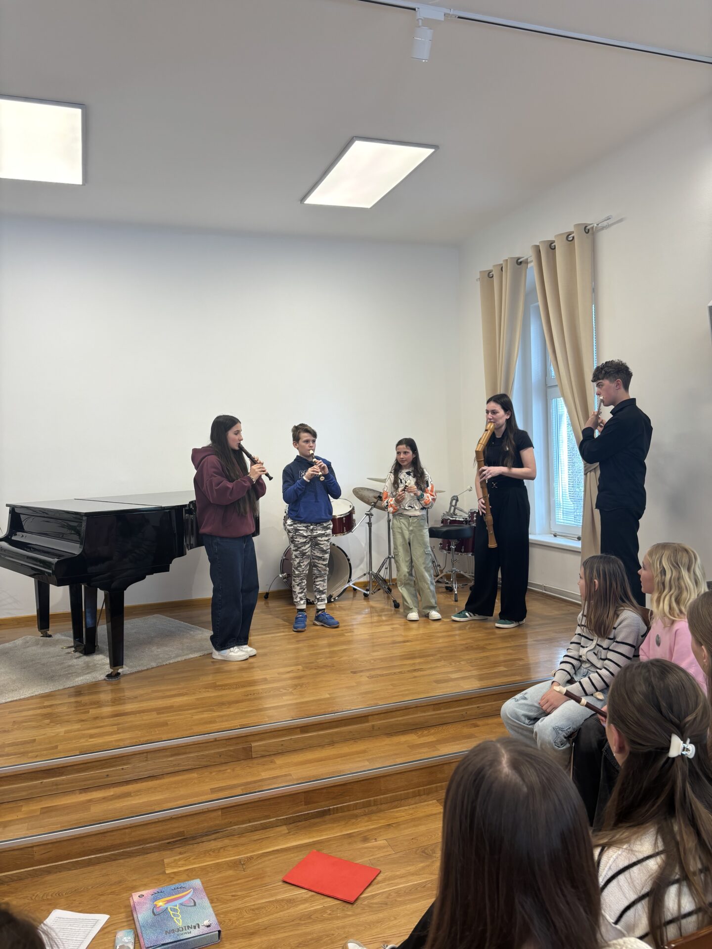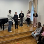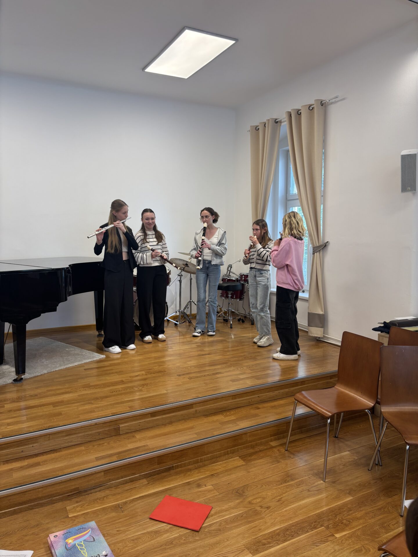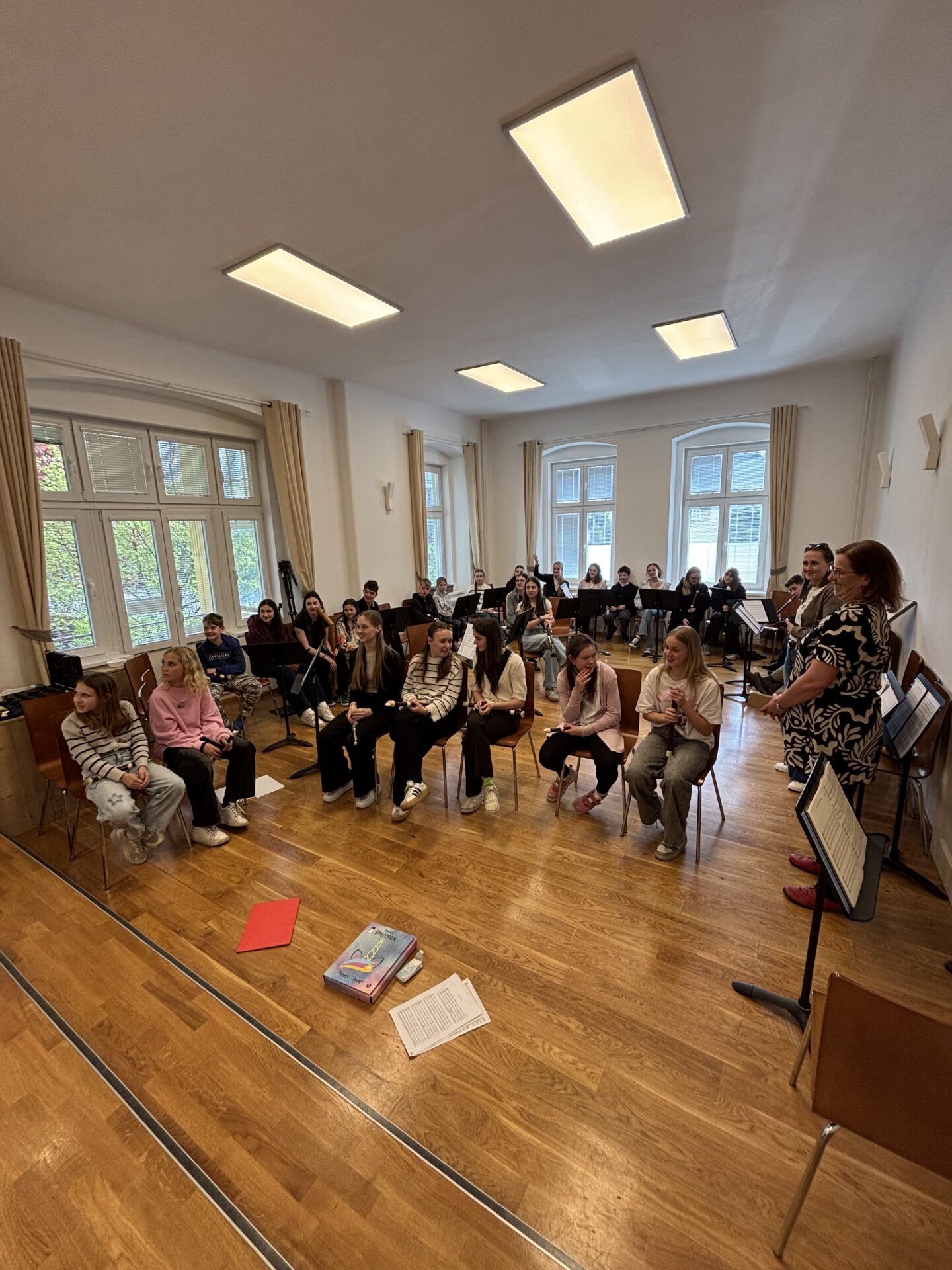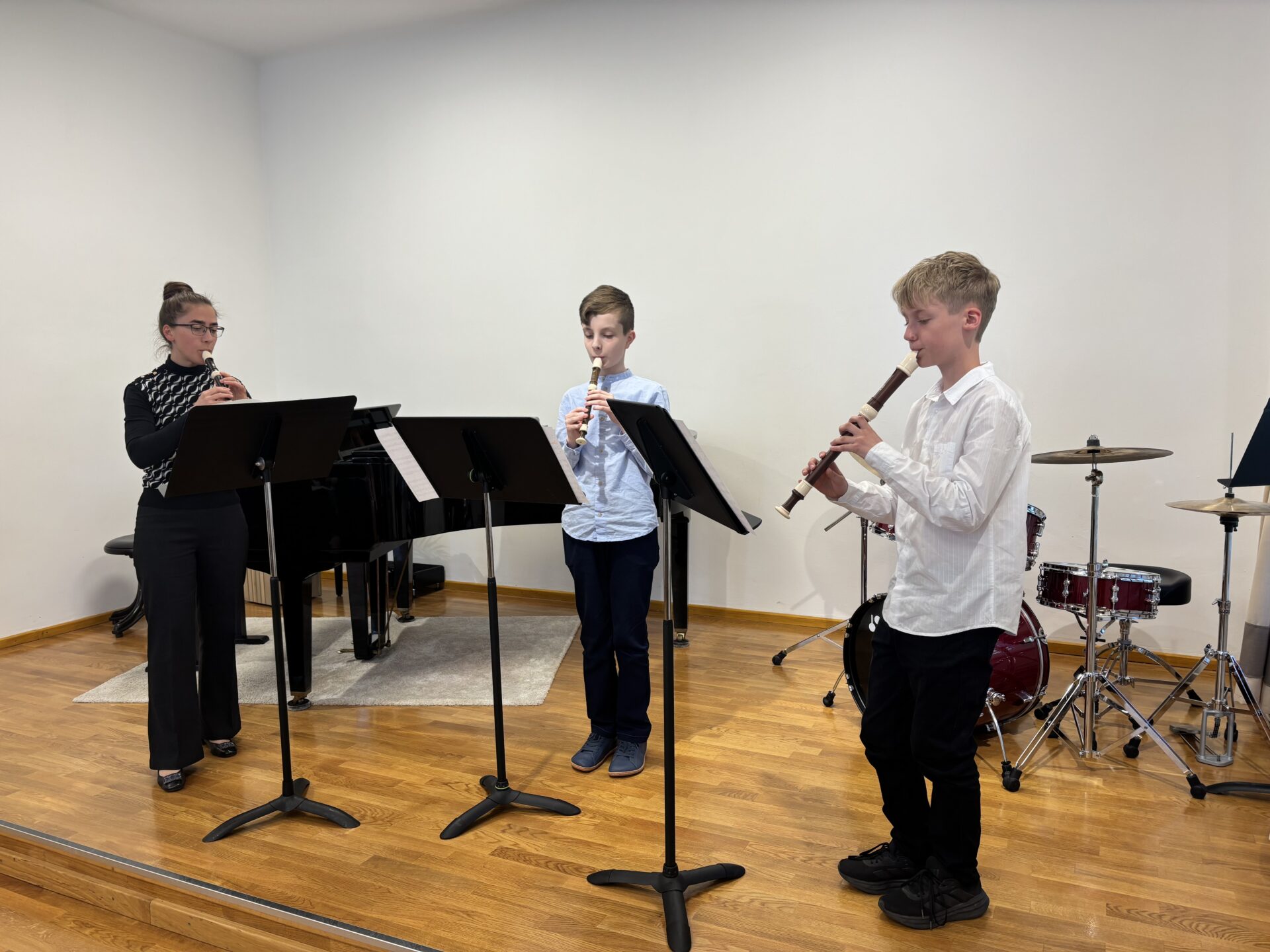 Po vydatném obědě, kdy si všichni pochutnali na pizze, přišla krátká pauza na odpočinek. Ta ale netrvala dlouho – hudební nadšení brzy znovu zvítězilo a pokračovalo se dál. Odpolední část patřila moderním technikám hry na flétnu. Žáci byli rozděleni do pěti skupin a čekala je kreativní výzva: vylosovat si téma a hudebně ztvárnit příběh. Objevily se nápady jako „hlemýžď na výletě“, „obchodní dům“ nebo „ptáček v továrně“. Každá skupina se s úkolem popasovala s odvahou i fantazií a vznikla originální a často i úsměvná hudební vystoupení.