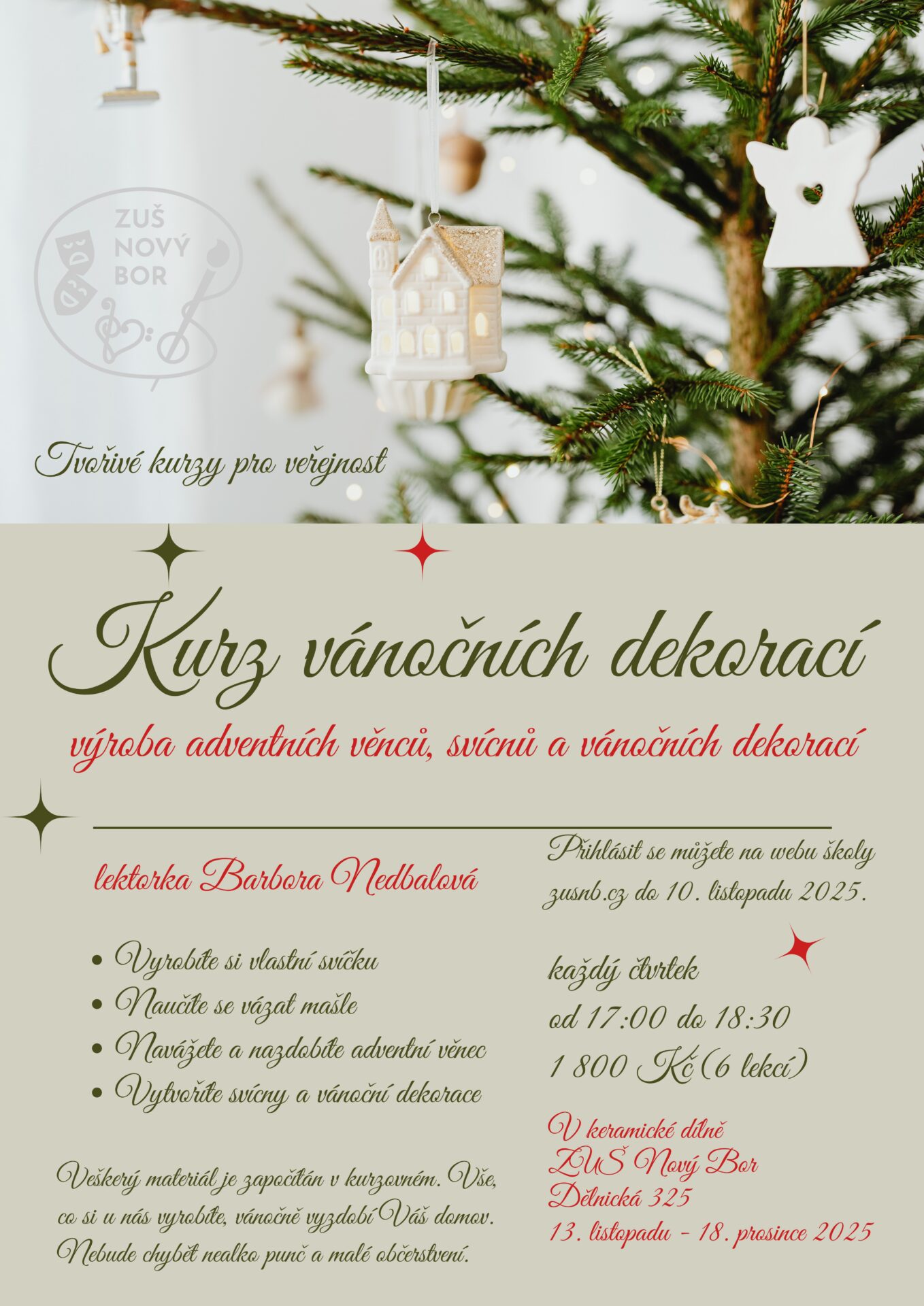 Kurzy povede lektorka Barbora Nedbalová v učebně VO, v Dělnické ulici číslo popisné 325, ZUŠ Nový Bor. Scházet se budete vždy jednou týdně ve čtvrtek od 13. listopadu do 18. prosince 2025 v 17:00 – 18:30 hodin. Lekce trvají hodinu a půl.